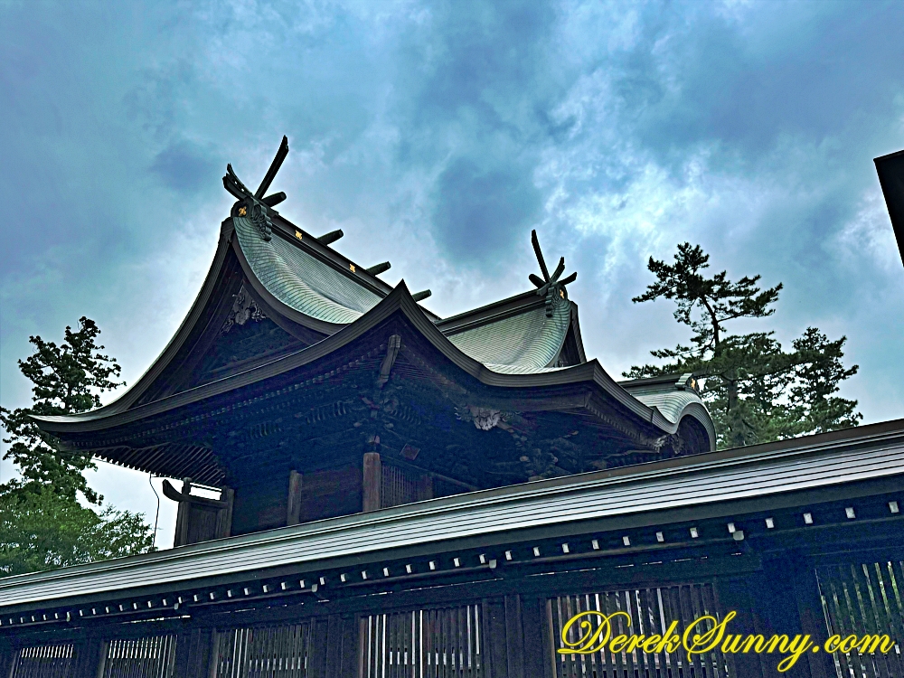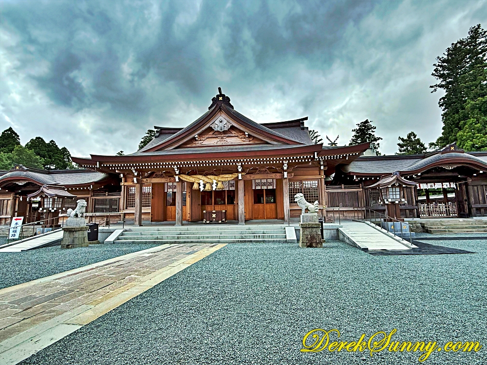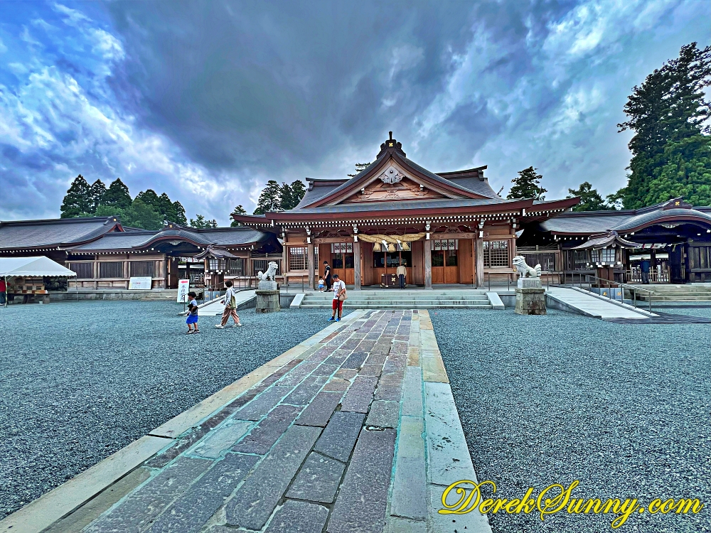 走過樓門,映入眼簾的就是阿蘇神社的主殿。這座主殿雖然沒有華麗的色彩,但那古樸的木造建築,在陰天時顯得格外莊嚴而肅穆,與周圍的石子地形成鮮明的對比,主殿內供奉著包括開拓阿甦的神武天皇之孫在內的12位家族神明,自古以來,它就與火山崇拜結合,以阿蘇山的火山口為聖物,被尊崇為肥後國第一神社。