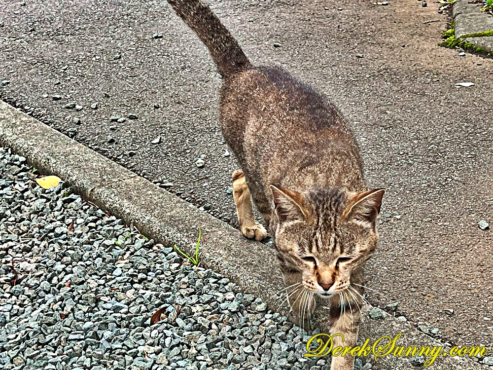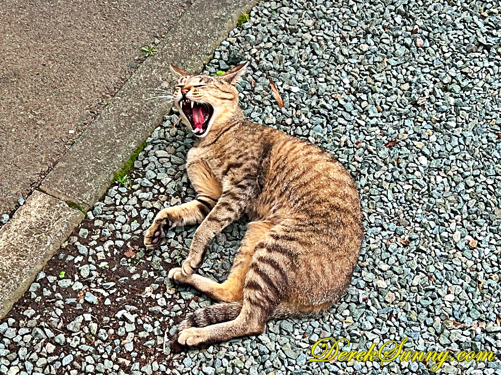 當我在神社裡散步,正享受著那份寧靜時,我的目光被一個超可愛的身影給吸引住了!!在石子路上,有一隻貓咪正豪邁地躺著,張著大大的嘴巴打哈欠,一副本喵就是這裡的主人的霸氣模樣,牠的毛色是帶有斑紋的虎斑,看起來既慵懶又充滿靈性,彷彿是這座神社的隱藏版喵星人守護者,如果你跟我一樣是個貓奴,來到阿蘇神社,除了參拜與欣賞美景,也別忘了放慢腳步,或許你也能幸運地遇見這隻可愛的喵星人,讓你的旅程多一份驚喜。