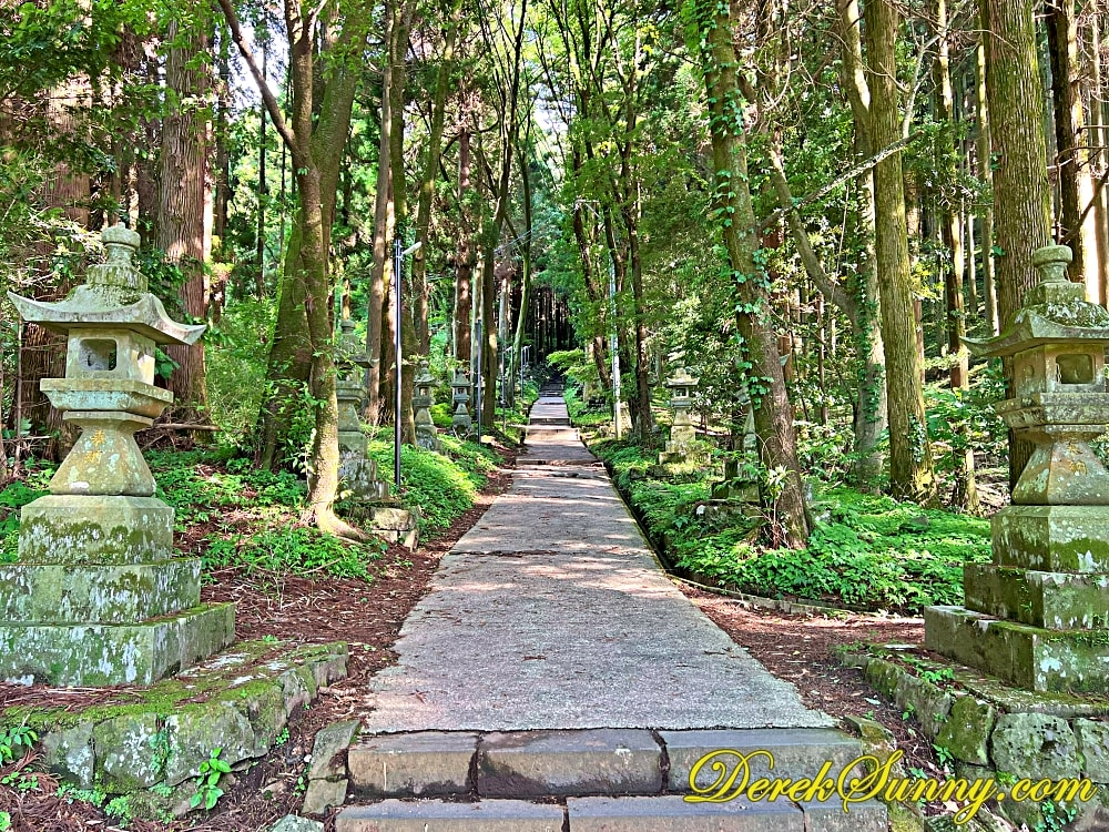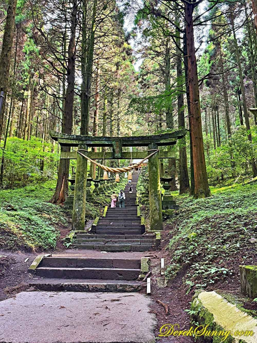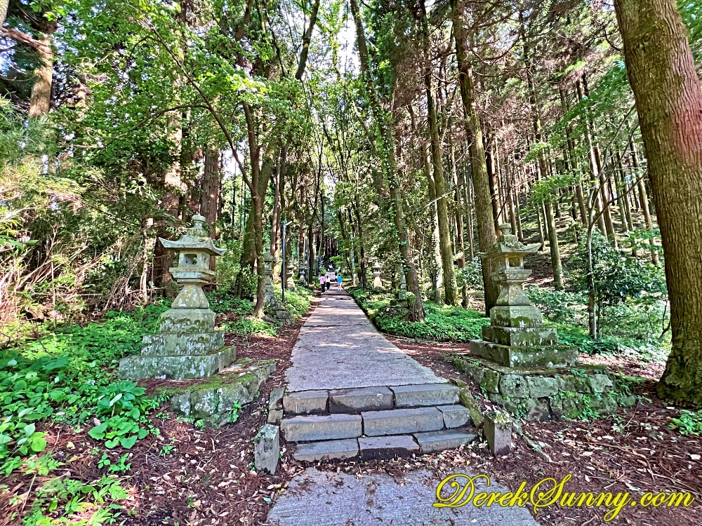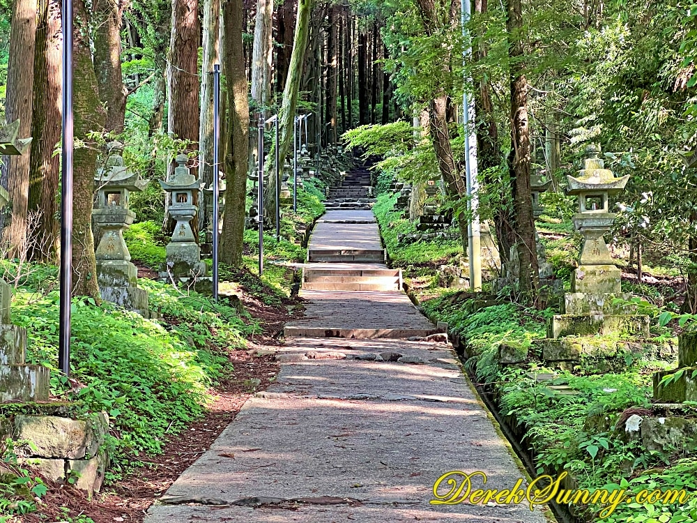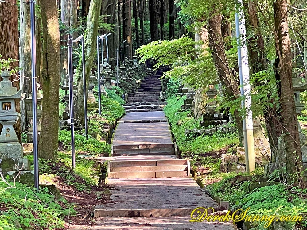 巨大的鳥居靜靜矗立,像是人類世界與神域的分界線,再往裡走,就是最迷人的石階步道,被高聳杉木環繞,樹影交錯、霧氣飄散時,完全就是宮崎駿動畫的既視感,如果你來的時候剛好下點小雨,濕潤的石階與迷濛的林間霧汽更有異世界傳送門的氣氛,沿路還有超過百座,長滿青苔的石燈籠,那種感覺,就像是有一條神秘的隊伍,在為你點亮前方的路,引領你一步一步走向未知的世界。