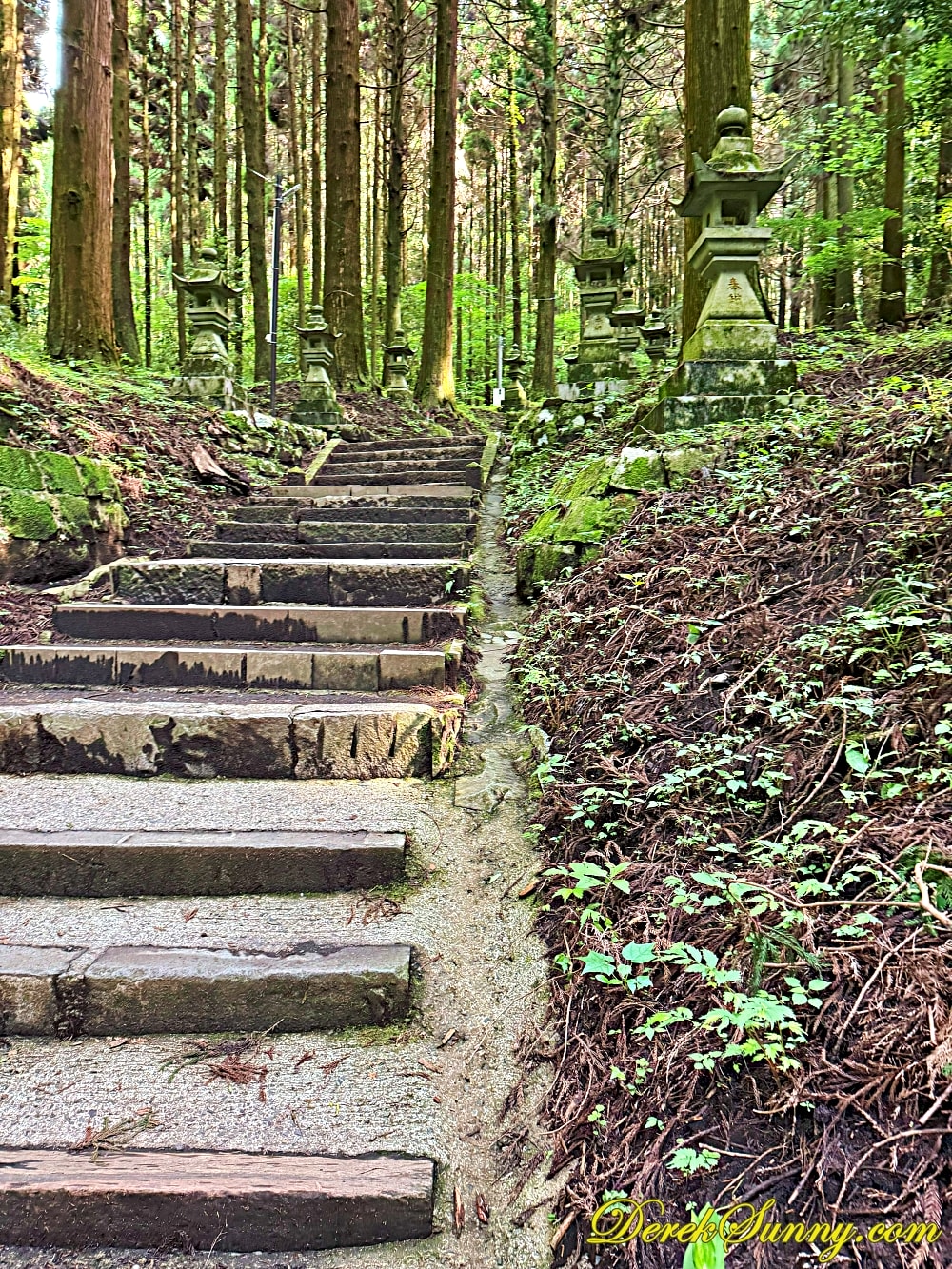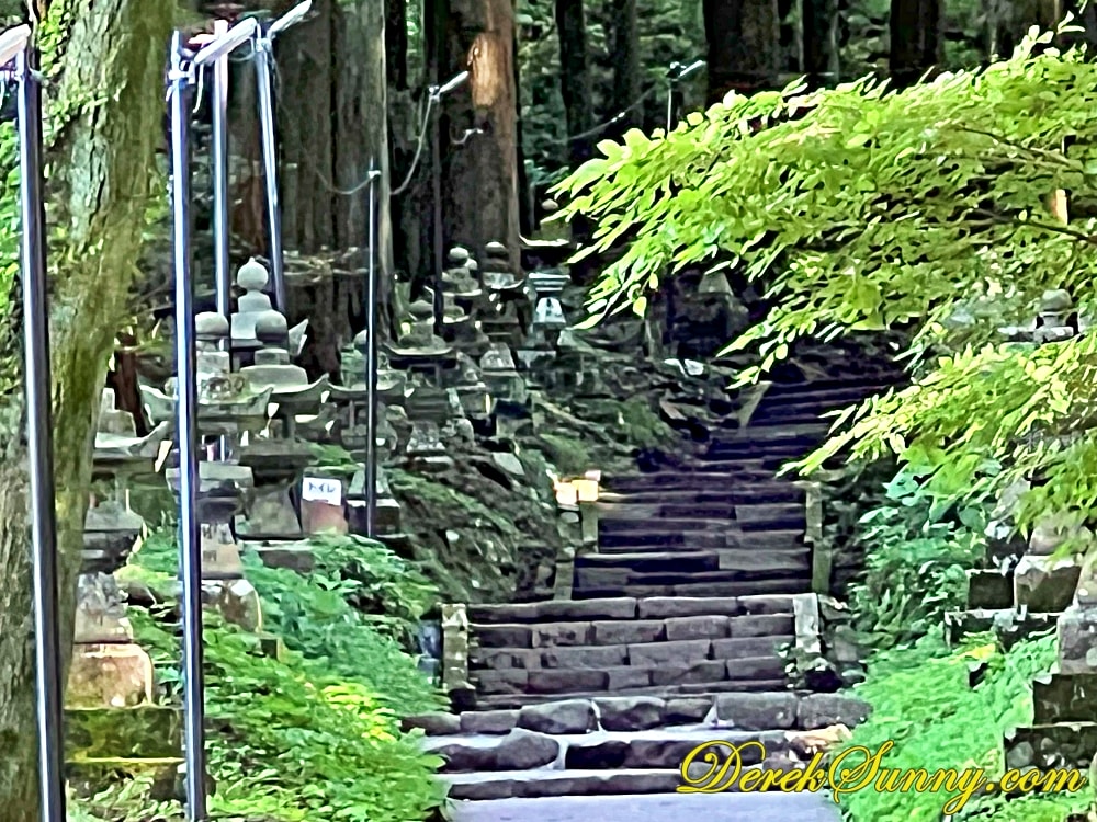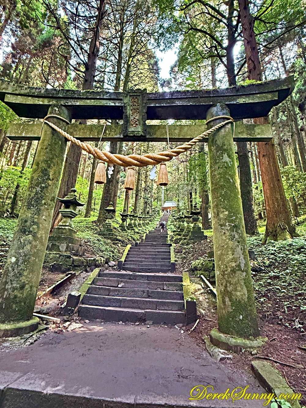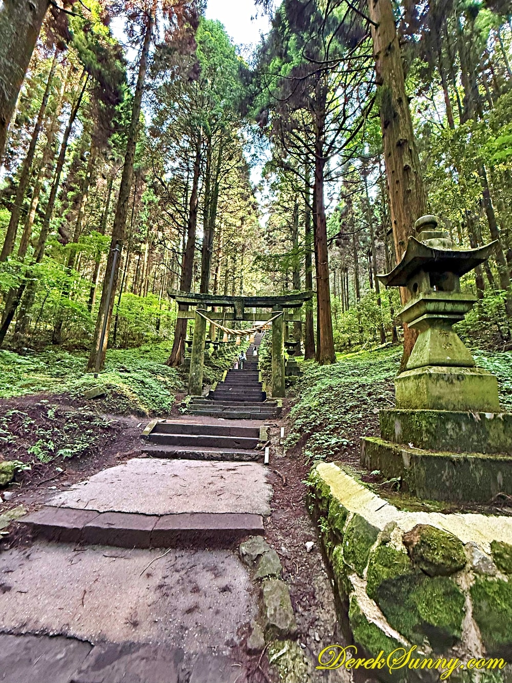 巨大的鳥居靜靜矗立,像是人類世界與神域的分界線,再往裡走,就是最迷人的石階步道,被高聳杉木環繞,樹影交錯、霧氣飄散時,完全就是宮崎駿動畫的既視感,如果你來的時候剛好下點小雨,濕潤的石階與迷濛的林間霧汽更有異世界傳送門的氣氛,沿路還有超過百座,長滿青苔的石燈籠,那種感覺,就像是有一條神秘的隊伍,在為你點亮前方的路,引領你一步一步走向未知的世界。