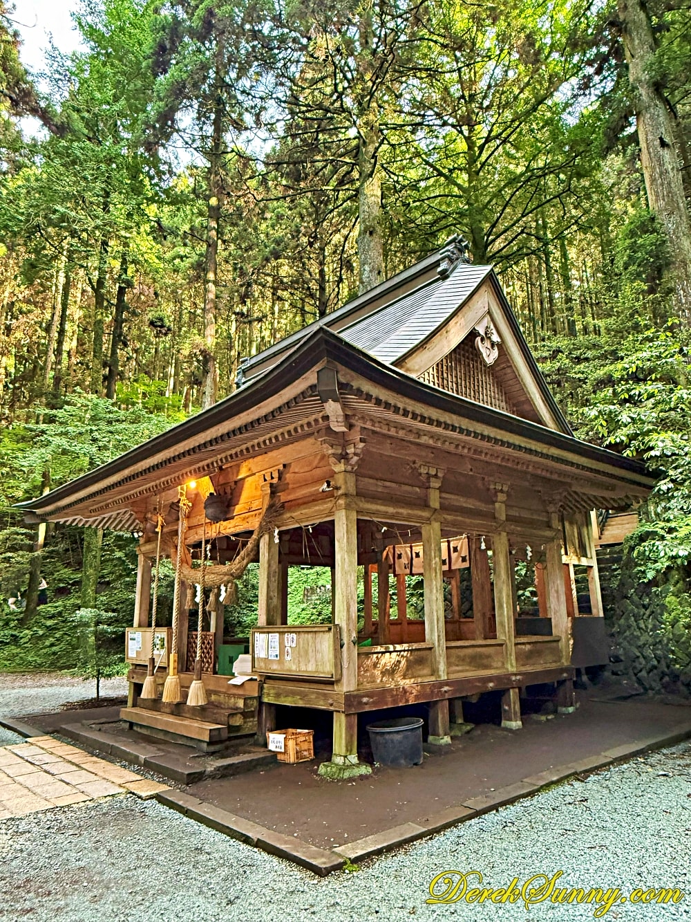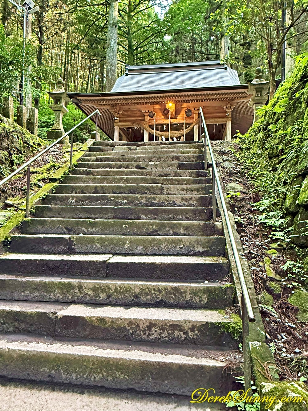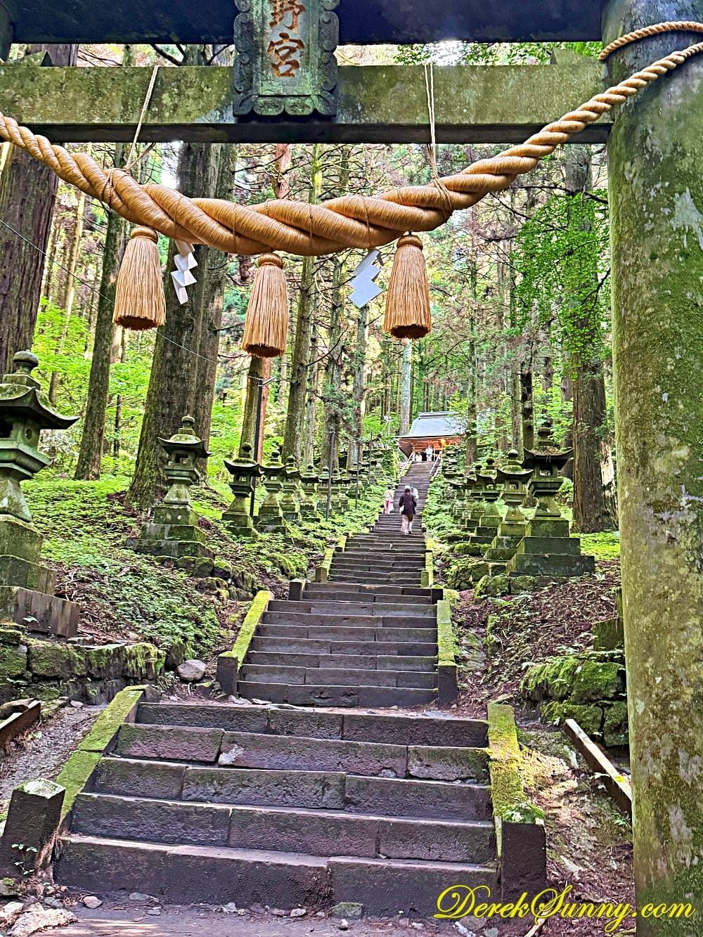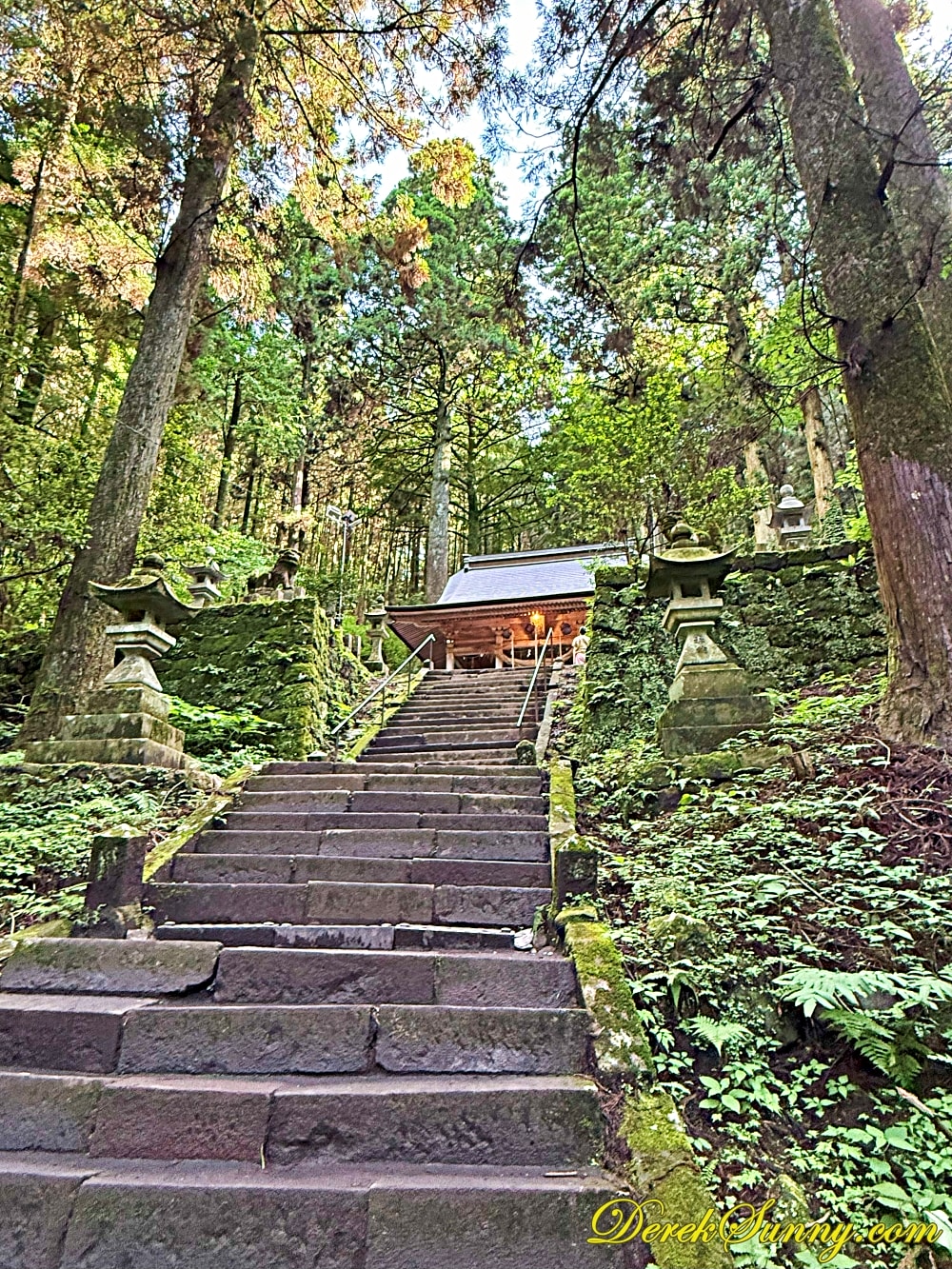 巨大的鳥居靜靜矗立,像是人類世界與神域的分界線,再往裡走,就是最迷人的石階步道,被高聳杉木環繞,樹影交錯、霧氣飄散時,完全就是宮崎駿動畫的既視感,如果你來的時候剛好下點小雨,濕潤的石階與迷濛的林間霧汽更有異世界傳送門的氣氛,沿路還有超過百座,長滿青苔的石燈籠,那種感覺,就像是有一條神秘的隊伍,在為你點亮前方的路,引領你一步一步走向未知的世界。